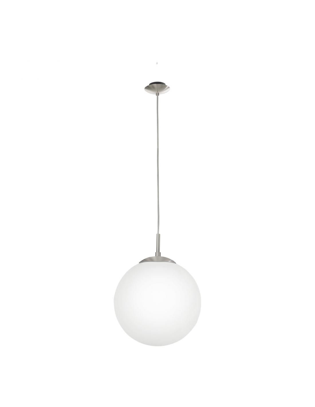 RONDO crystal pendant lamp of 30 cm in diameter, made by EGLO, in matte nickel-colored steel and matte white opaline glass. Requires an E27 bulb, not included. An ideal lamp for both living room, bedroom and entrance or over a breakfast bar. A classic top seller on our website.