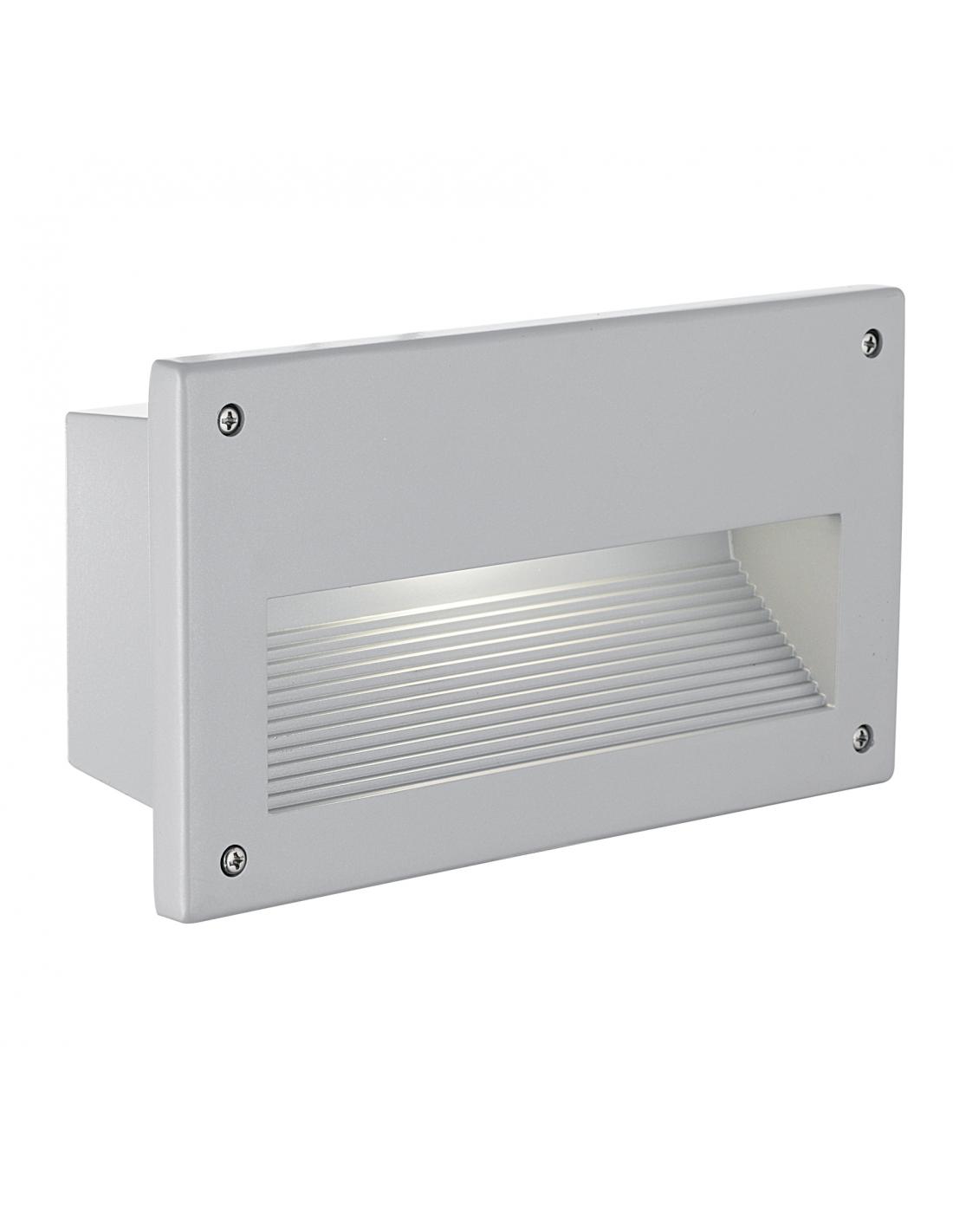 Recessed outdoor lamp with IP44 protection degree perfect for recessing in walls and passageways, made of silver cast aluminum and with a luminous surface of satin glass. It uses an E14 bulb, not included. Its size is 22.7 cm x 12.7 cm and an installation depth of 7.5 cm. A hole of 19.6 x 9.6 cm is required for its installation. Its lighting is indirect diagonally. Bring your outdoor spaces to life!
