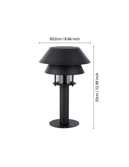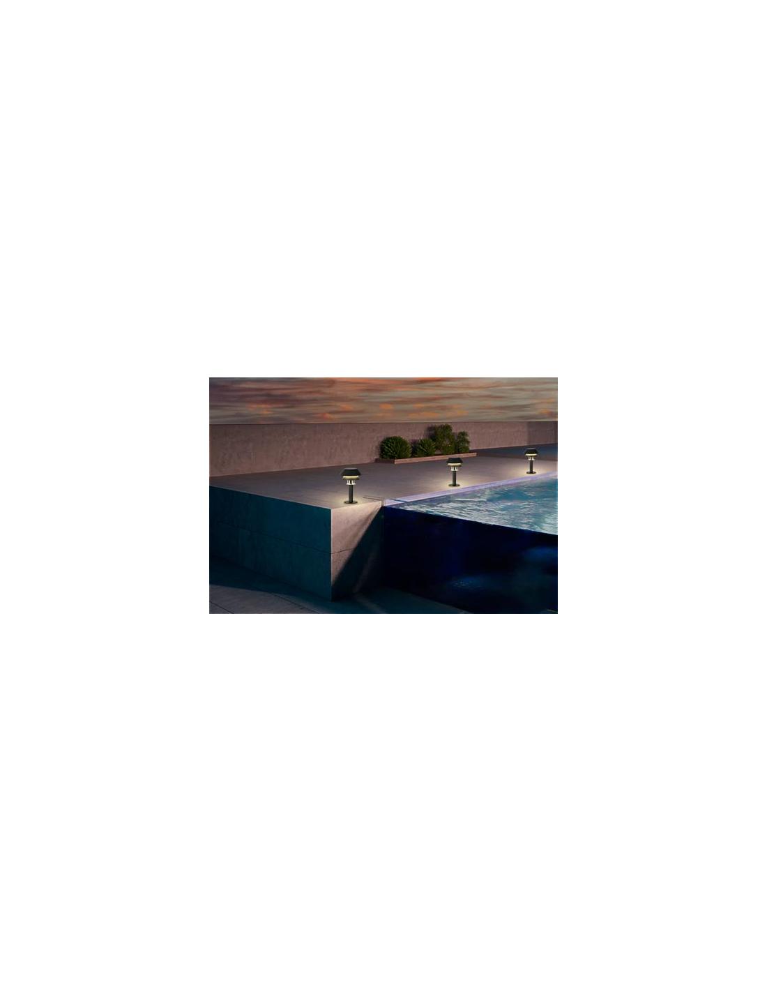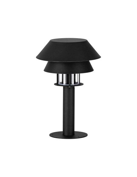 The Chiappera wall lamp or plinth is made of black steel with two overlapping conical shades of different sizes, in the center of which there is a glass cylinder where the E27 socket is. The lamp is made waterproof and dustproof (IP65) so it is perfect for outdoors, on a terrace, balcony or garden. The lamp is suitable for any E27 socket bulb, not included.