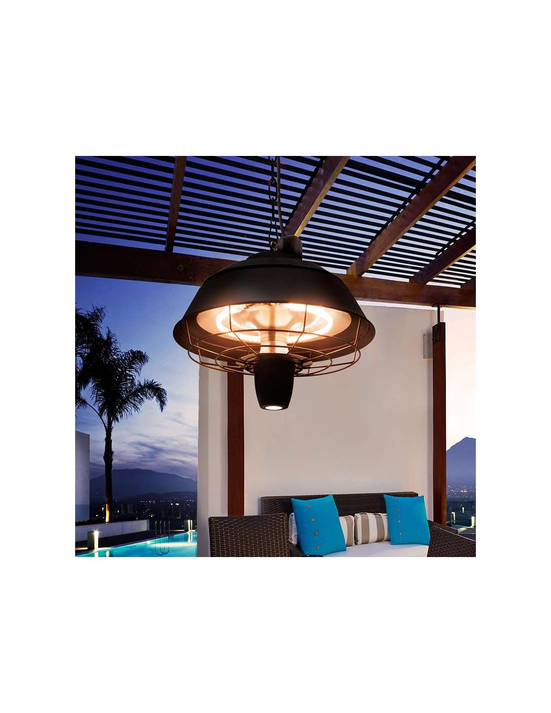 Electric stove for ceiling installation, suspension type. Made of metal and plastic, black finish. 600/900/1500W halogen heating. 1W LED light. Remote control. Cable:1.8 m. IP44.