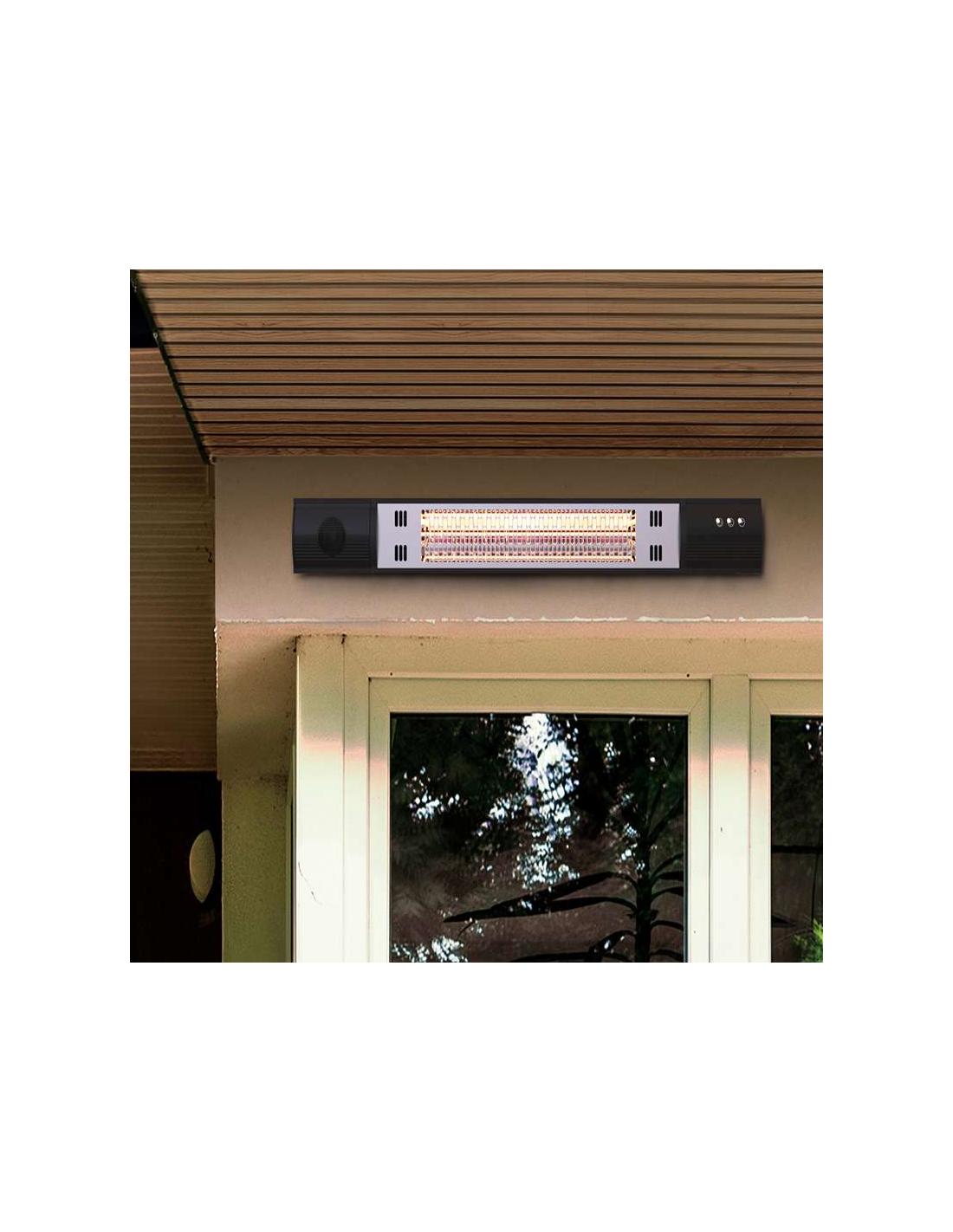 Electric stove for wall installation, with bluetooth speakers. Made of metal and plastic, black finish. 1500W halogen heating. Remote control. Timer. Includes arm for installation. Cable:1.8 m. IP55.