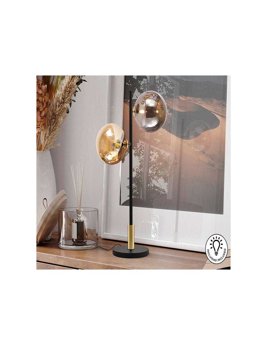 2-light table lamp, made of matte black finished metal, with satin brass detail. Spherical glass amber and smoke tulips of 12 cm.