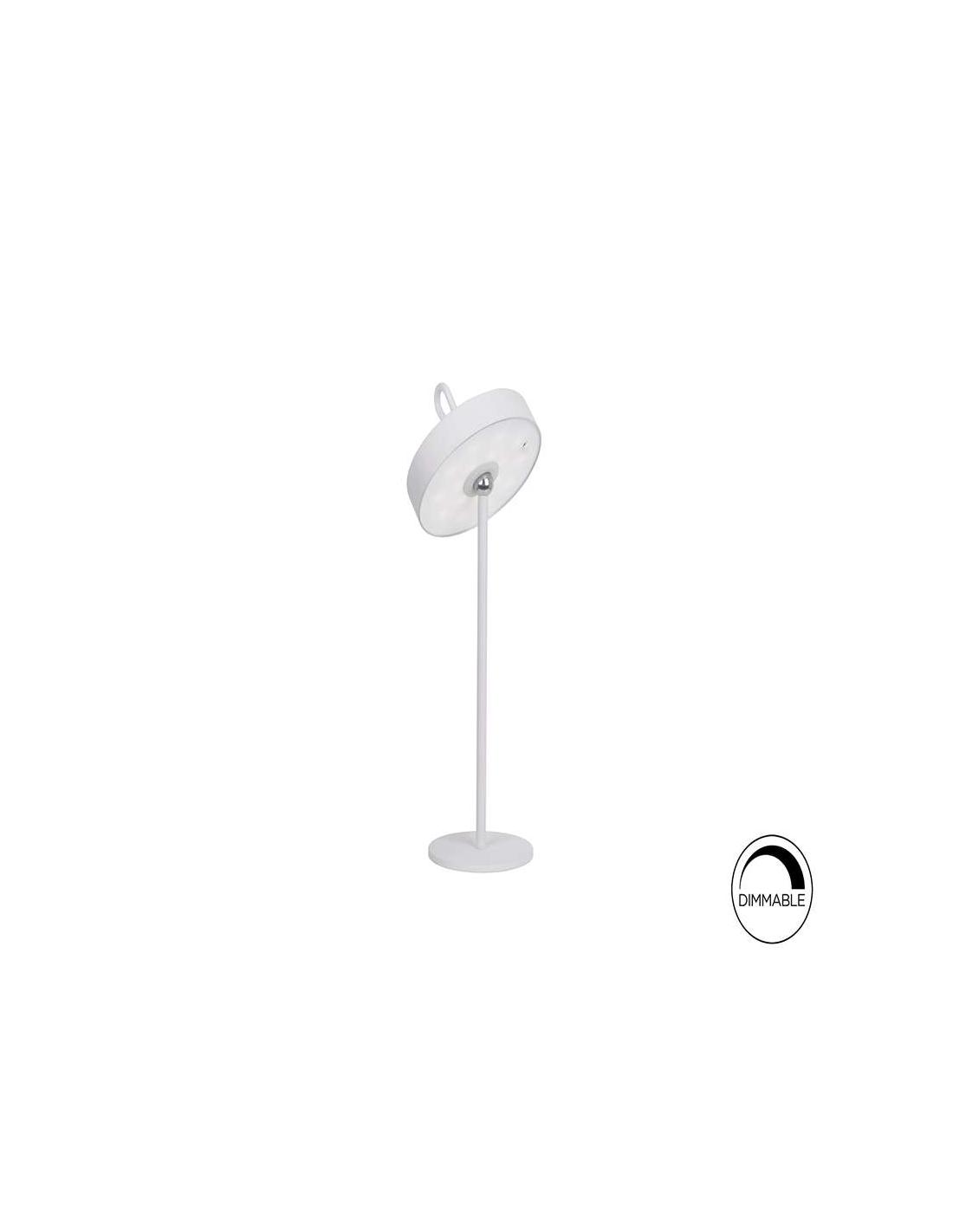 LED table lamp for indoor and outdoor, portable screen with silicone handle and magnetic stand. Made of white finished metal and opal acrylic diffuser. 2.5W LED, 140lm, 3000K. DIMMABLE. IP54.