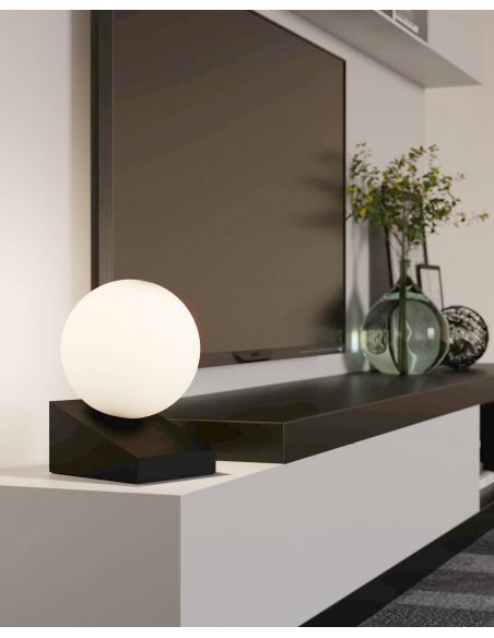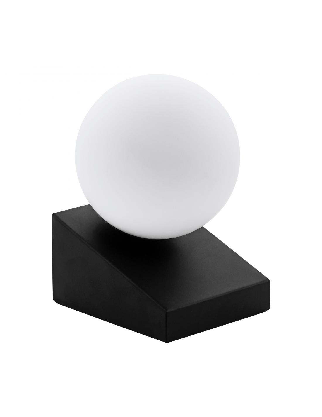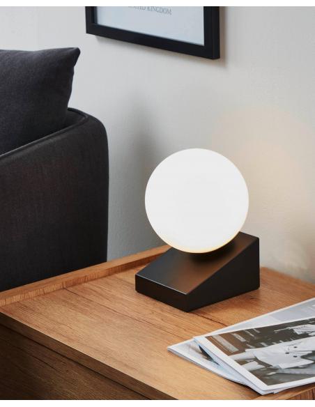 Table lamp made of white opal glass with a black base in geometric clip shape. If you are a fan of avant-garde works of art, the Bilbana lamp has to be for you. Requires an E14 bulb, not included.