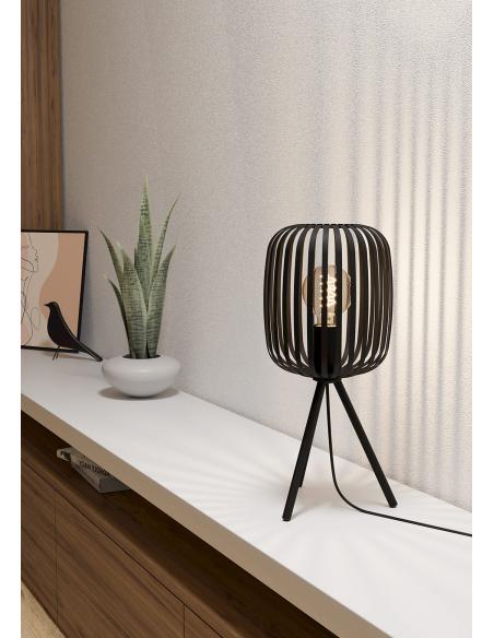 Tripod table lamp made of black steel with a caged shade, which will diffuse its light very beautifully and elegantly. This lamp is perfect for illuminating bedside tables or sideboards, and uses an E27 socket bulb, not included. It is operated with a cable switch.