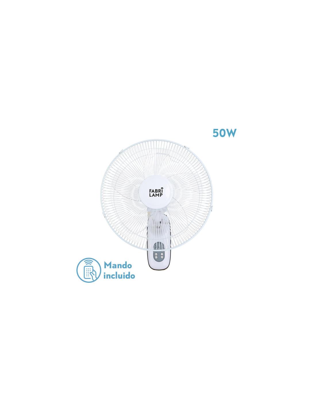 Wall fan from the CUTA series made of metal and polycarbonate, in WHITE color with five TRANSPARENT blades and three speeds. AC motor. With 2 head positions, fixed and rotating, also oscillating, being able to redirect the air to the area you want, with Remote Control INCLUDED and TIMER FROM 0.5 to 7.5H. It has a consumption of 50 watts and a measurement of 53X43x30 centimeters.