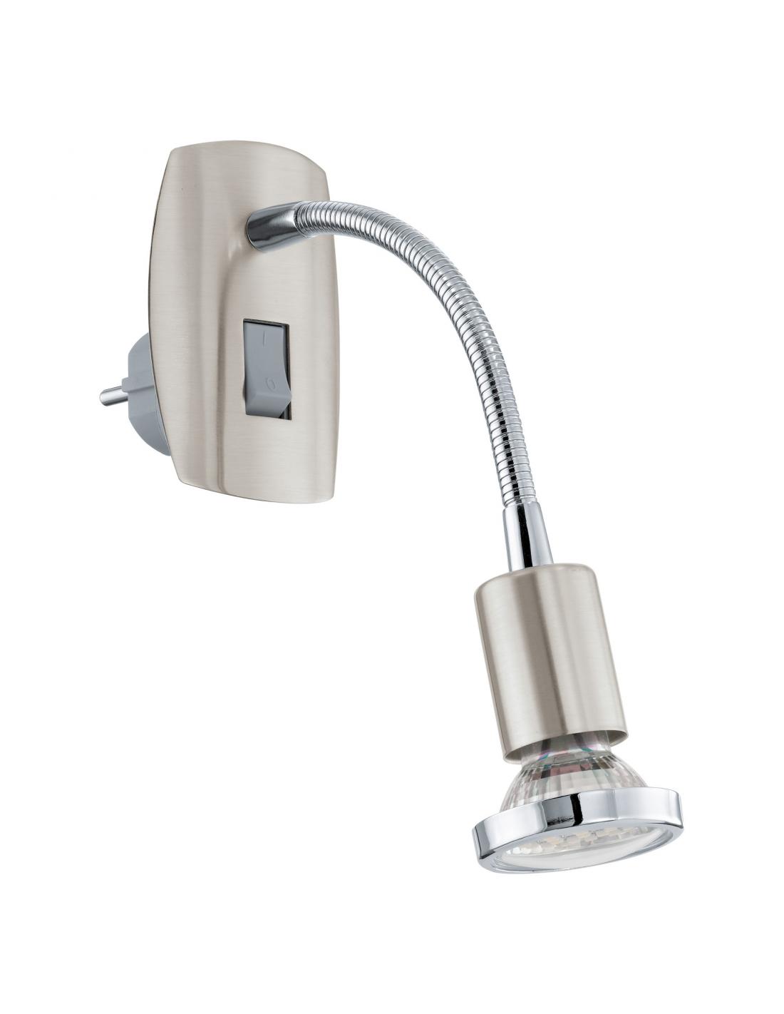 Matte nickel gray wall socket lamp and flexible arm in chrome. Its GU10 bulb is included and has a color temperature of 3000k, warm neutral. A very useful and simple lamp that you will only have to plug into the socket of any wall and any room and you will have it ready to use. Ideal for readers or people who need an extra light source and little space. Very comfortable and easy to use.
