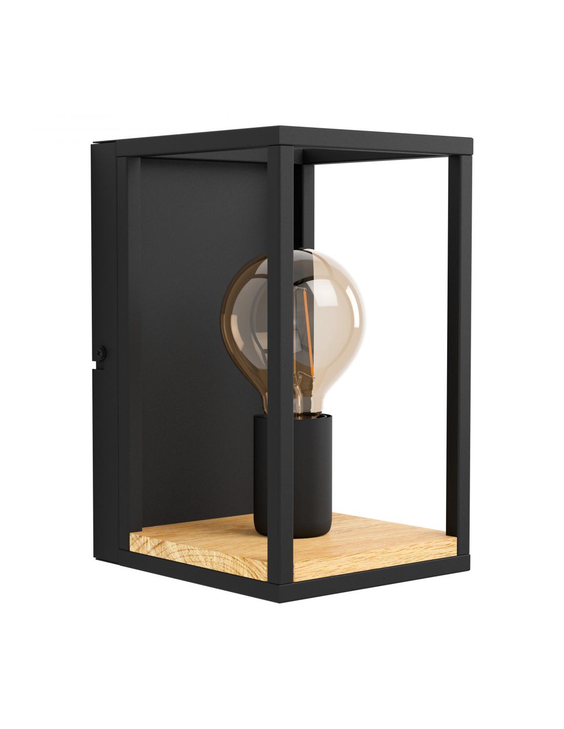 Industrial wall lamp made of black steel with simple lines and a natural wood lamp holder base. Ideal in any room or transit area. It uses an E27 socket bulb, not included.