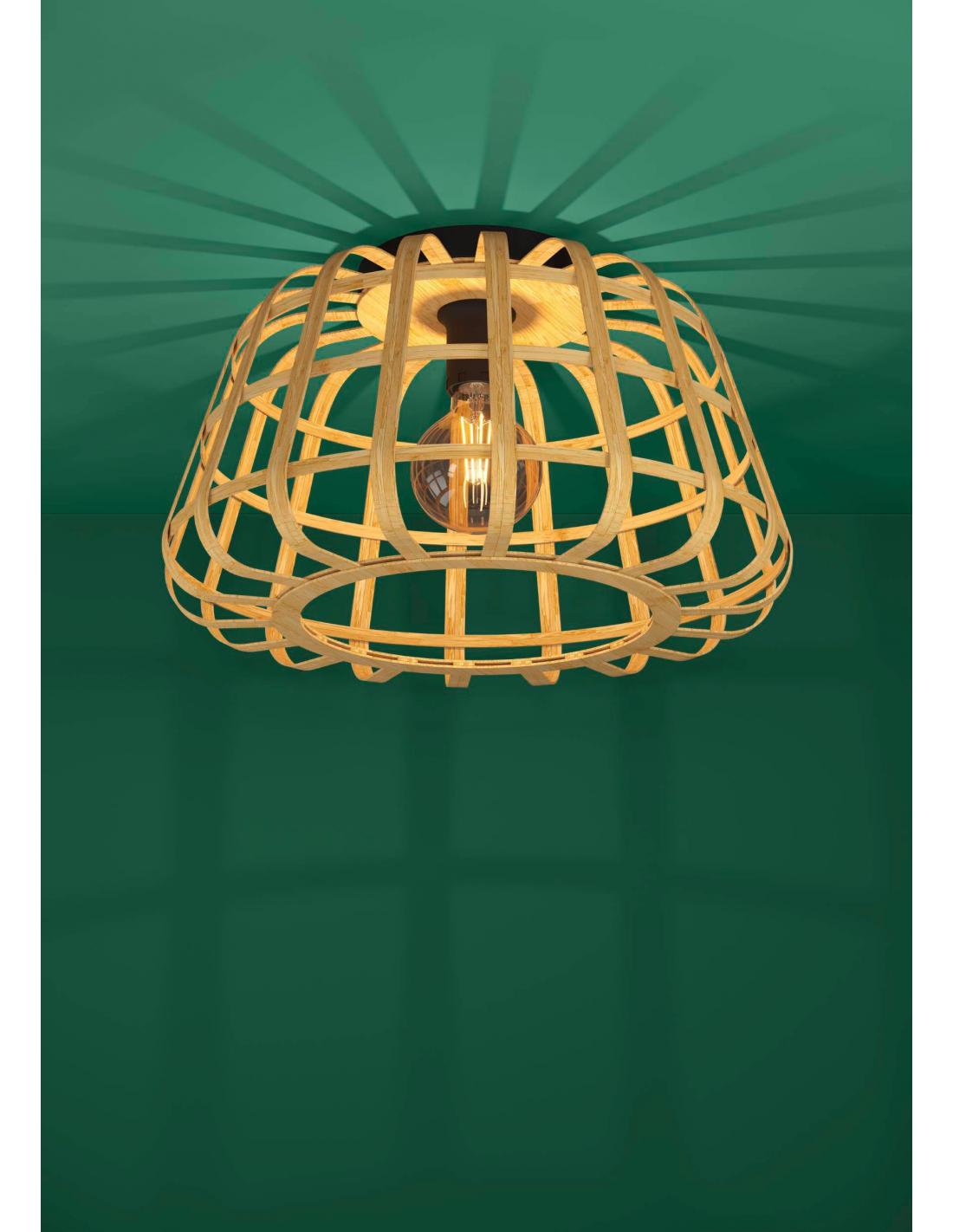 Wooden ceiling light with steel base with very original cage-like design. A very flattering trend to illuminate any room in your home, be it your entrance, living room, bedroom... And give it a natural touch. Requires an E27 bulb, NOT INCLUDED.