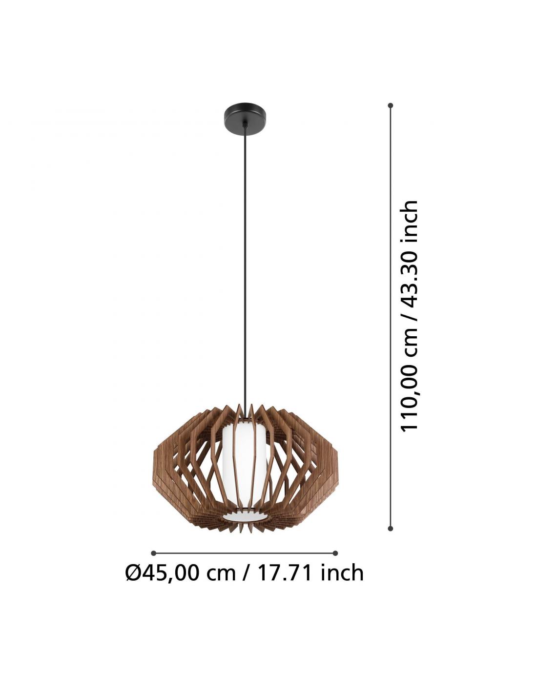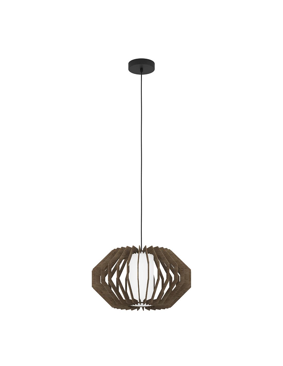 Hanging lamp made of wood formed by multiple flat rods prearranged circularly resulting in a very modern geometric shade, suspended from a black cable and base, the latter made of steel. The wooden shade inside has a cylindrical opal white glass shade to prevent flashes. It uses an E27 bulb, not included.