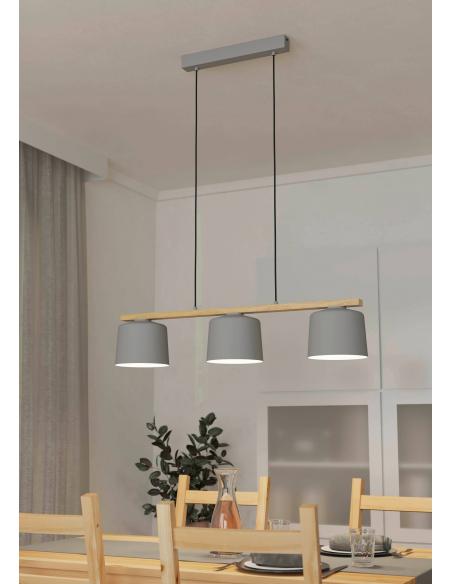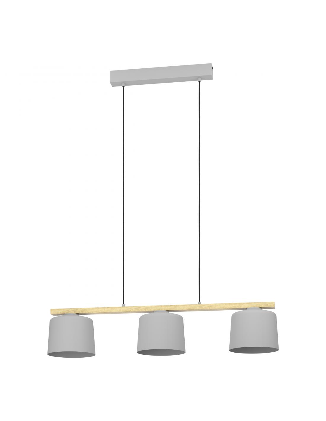 Three-light pendant lamp with gray tulips as well as its base, all steel, and wooden beam to support the tulips in natural finish. A piece that you can adjust in height thanks to its adjustable cables and that will fit perfectly in a dining room with a Nordic or romantic aesthetic, thanks to its soft lines and neutral colors. It uses three e27 socket bulbs, not included. This model of the lamp is available in a ceiling lamp version, within the same Mariel collection.